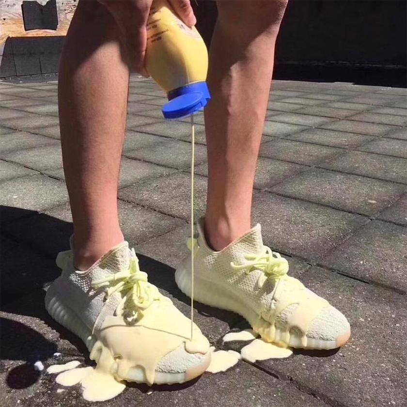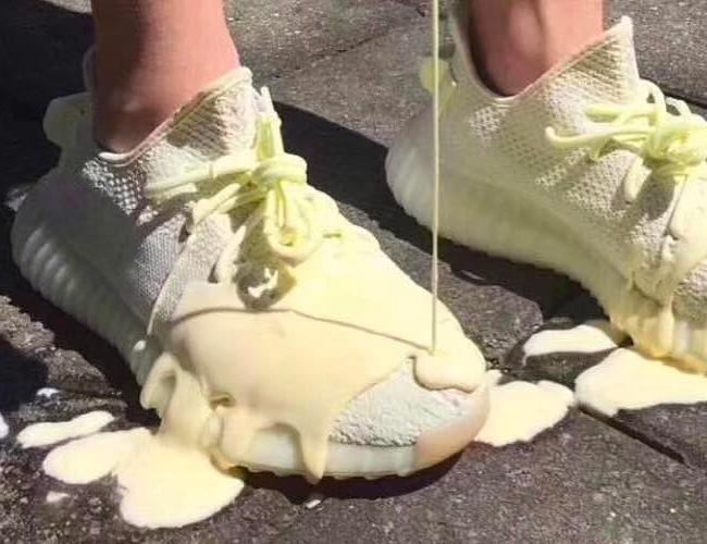 论脑洞就服万千网友,近日有一名国外网友晒图,在自己的Yeezy 350v2 Boost “Butter”上浇上了“真黄油”,这画面不忍直视。还真是能玩...不知道是不是事先喷好了防水喷雾...
