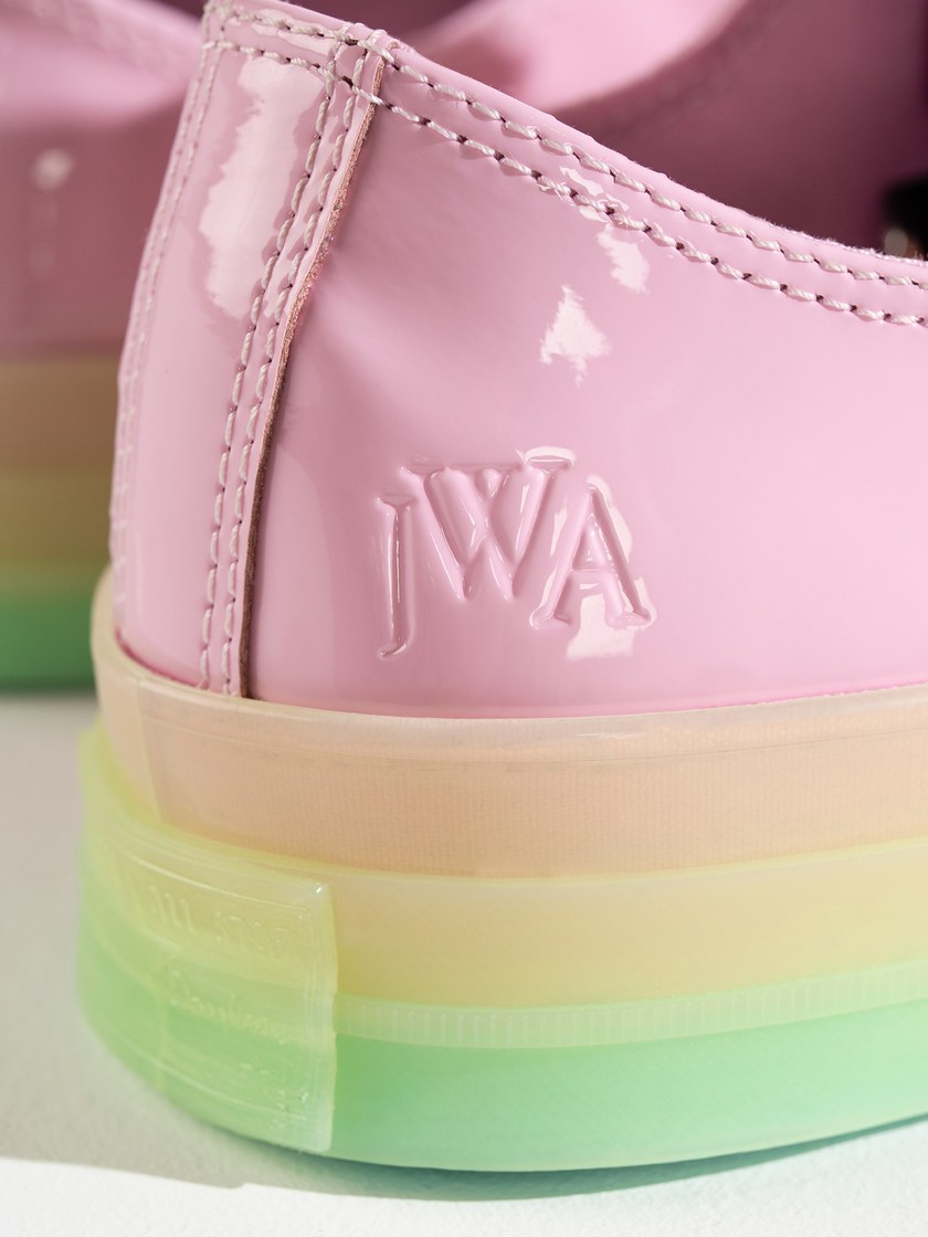 新系列在设计上大胆选用了具有独特“光泽”的彩色漆皮材质制作鞋身,除了紫色和粉色两双低筒版本外,另外两双高筒版本更采用了橙/红和紫/绿色的渐变鞋面效果,为经典的 Chuck 70 注入更多年轻意味和艺术气质;至于鞋带部分则是从墙面上常见的粉饰灰泥记取灵感,采用了加宽的毛圈布制作而成,并且每双鞋均配有一副额外的彩色鞋带,最后在鞋帮位置以“JWA”字样表明合作身份。