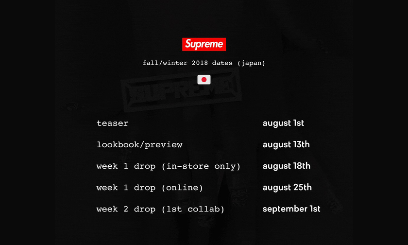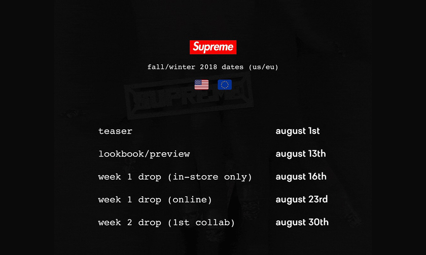Supreme 2018 春夏发售顺利完结,又到了 Supreme 粉常规的 “暑假” 时间,不过这个假期不会太久,根据知名 Supreme 情报账号 @dropsbyjay 的爆料,2018 秋冬系列的 “剧透” 将会在 8 月 1 日释出,正式的 Lookbook 则将于 8 月 13 日发布,随后欧美地区 16 日进行第一周发售,日本则是 18 日。还等什么,赶紧开始攒钱吧!
