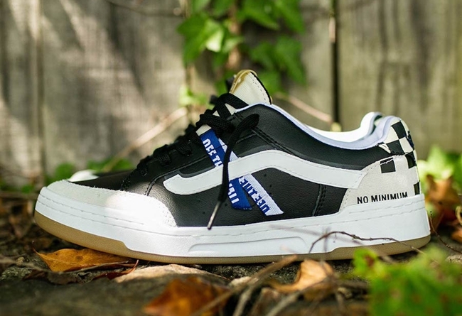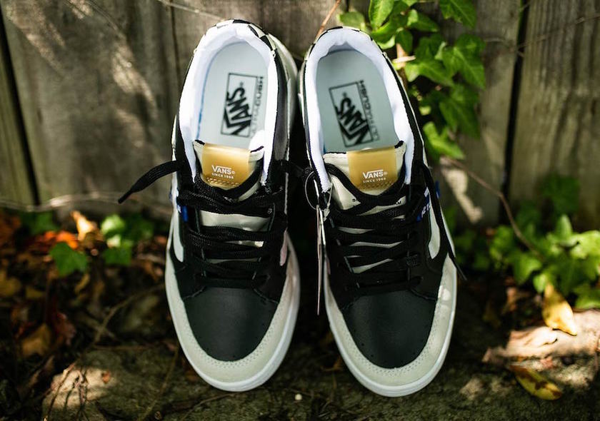 近日 Vans 再度发售一款解构设计的滑板鞋。这款名为 Vans Highland Construct 的滑板鞋,鞋身由黑色皮革、灰色麂皮打造而成,同时搭配解构风的蓝色飘带点缀。后跟采用了 Vans 特色的棋盘格设计;其鞋舌上生胶色的标签,给人一种复古的感觉,解构风格体现淋漓尽致。