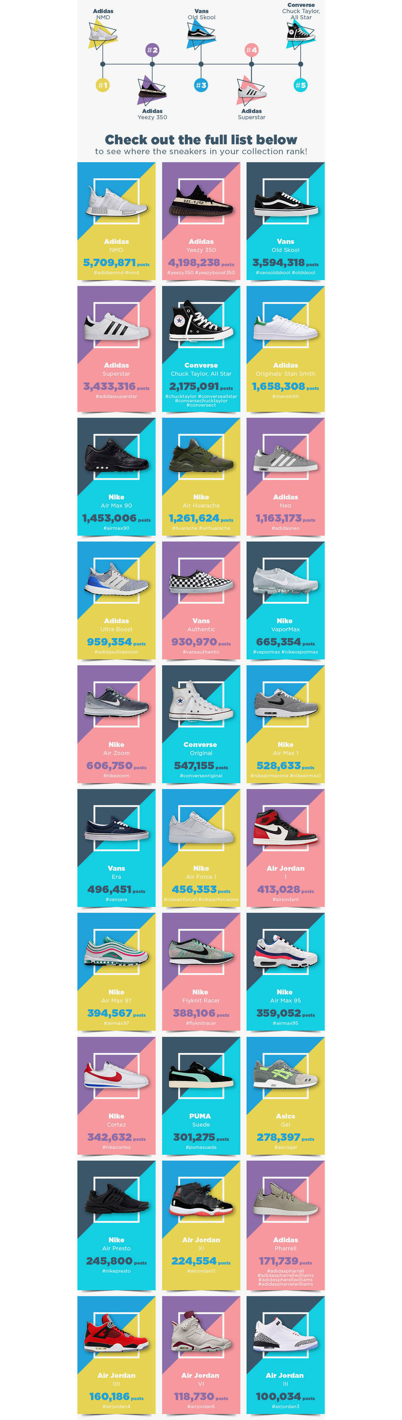 尽管 Nike 的运动球鞋行业之王,但在社交媒体上,却远远落后于 adidas。adidas 的 NMD 和 YEEZY BOOST 350 都分别领先其他型号鞋款,分别拥有五百七十多万及四百一十多万的标签,Vans 也凭着三百五十多万获得第三,至于第四和第五名则是 adidas 的 Superstar 及 Converse 的 Chuck Taylor All Star。反之 Nike 鞋款位列第七及第八,而 Air Jordan 1 只仅仅身处于第十八位。