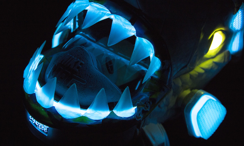 球鞋面具艺术家 Freehand Profit 把一双 Nike 在 2011 年时限量发售的 Air Mag 改造成了一款鲨鱼造型的球鞋面具!看起来就很贵!重点的 LED 元素被 Freehand Profit 发扬光大,除此之外球鞋的各部件以及材质也被重新组合成了 “鲨鱼” 的面部。Nike Air Mag 鲨鱼面具仅此一件,相信价格也是相当不菲。如果你还想了解 Freehand Profit 的更多作品,可以通过其 Instagram 查看。