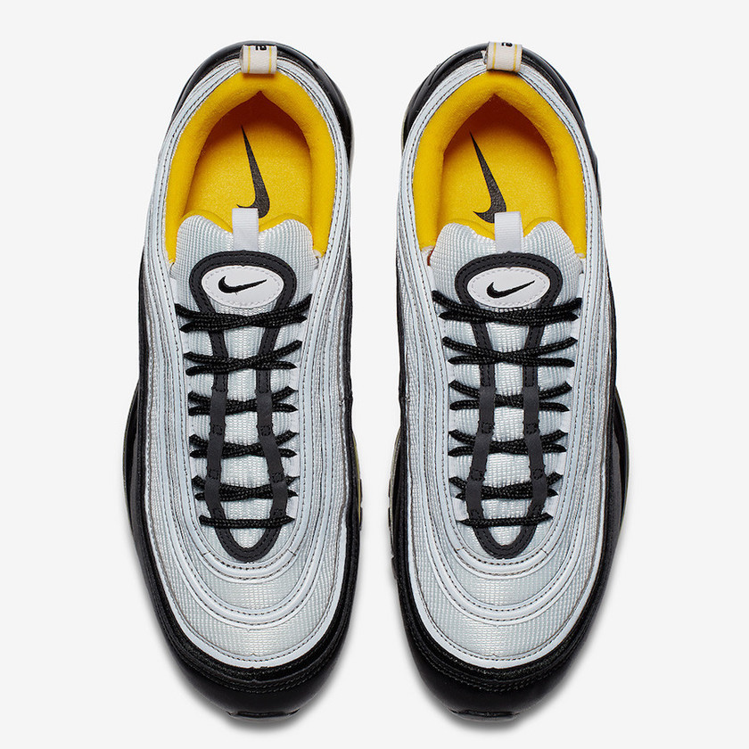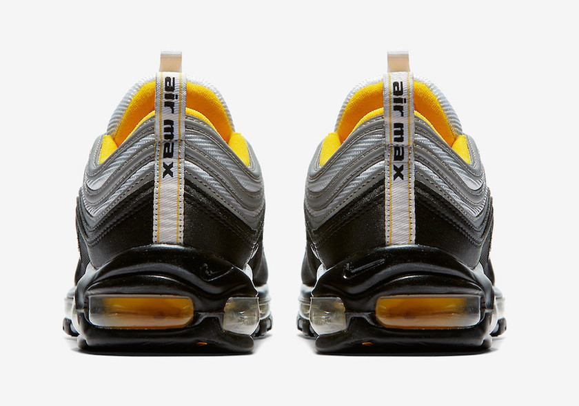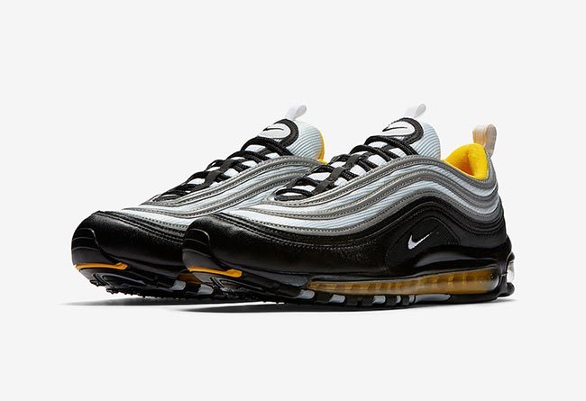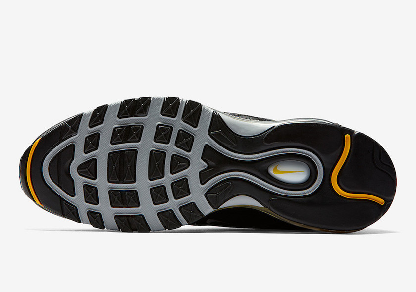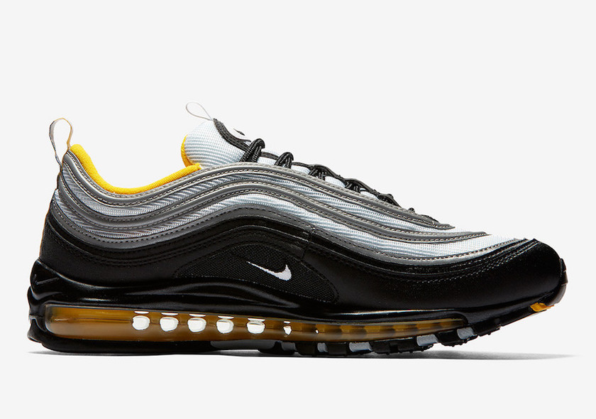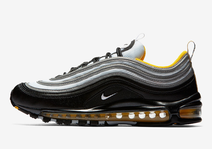 Nike此番为经典复古鞋款 Air Max 97推出全新的 “Pittsburgh Steelers” 配色,以 NFL 的球队匹兹堡钢人队为灵感打造,黑色与白色相互碰撞的鞋身,搭配黄色的内衬、后跟标签和气垫内柱,拥有色差的条纹让鞋身更具有层次感,相信上脚效果也是绝佳的。