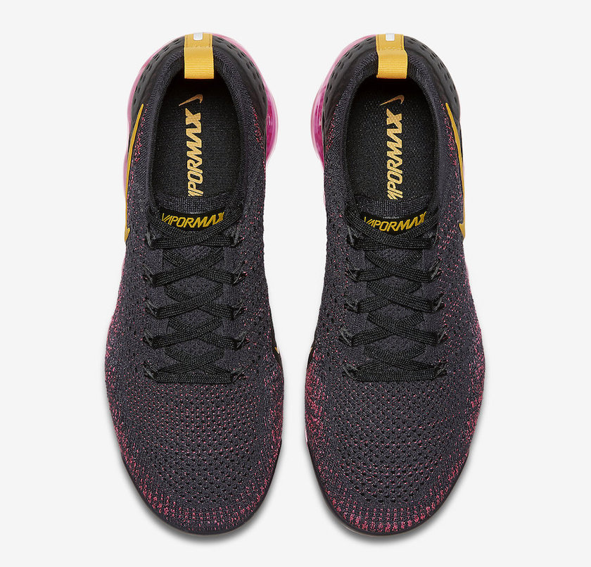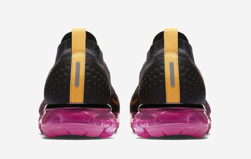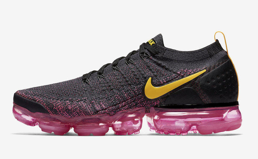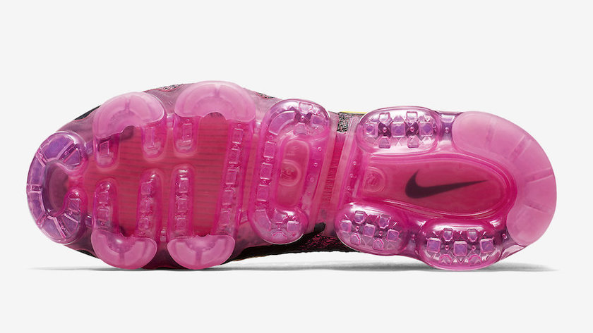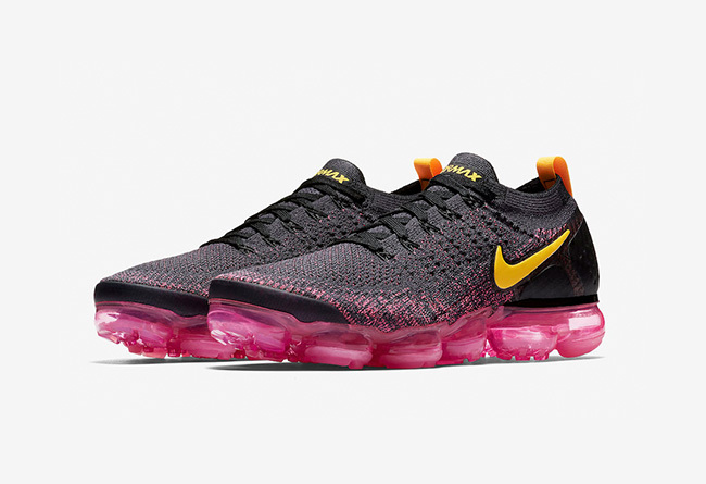 Nike 此番 Nike Air VaporMax Flyknit 2.0 版本带来了一款“骚气十足”的新配色,以 “Pink Blast” 命名,鞋款整体以深灰色 Flyknit 编织材质打造鞋面,细节中加入亮黄色与粉色点缀,搭载粉色透明 Air VaporMax 气垫,低调中不乏亮点。