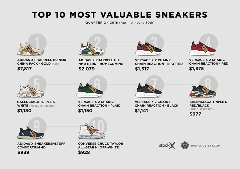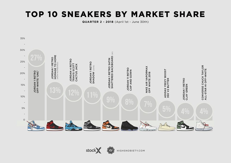 近日,德国著名潮流艺术网站 Highsnobiety 与著名球鞋转卖平台 StockX 一起,带来了2018年第二季度(4-6月)的球鞋排行榜,分别是最有价值的 10 双球鞋以及最高市场份额的 10 双球鞋。