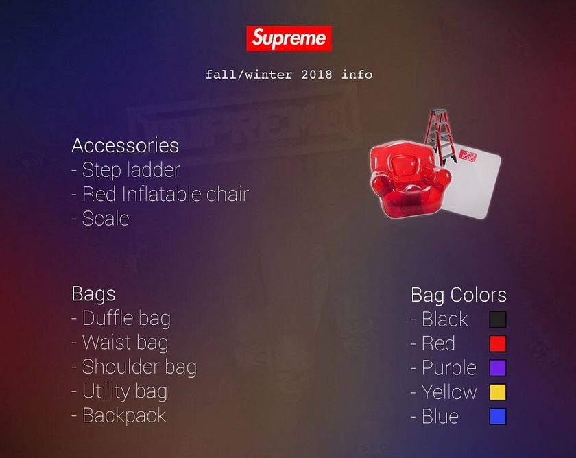 今天网络上曝光更多Supreme 2018 部分配件谍照,最抢眼的可能是这款 Supreme x Mophie 充电手机壳,届时会有 iPhone 7、8 和 iPhone 7、8 Plus 适配版本,但可能并不包括最新的 iPhone X。此外本季 Supreme 还会发售折叠梯、充气沙发和体重秤,从不缺少惊喜的配件选择仍旧没有令人失望。眼看着消费时间进入倒计时,各位 Sup 粉丝准备好充足预算了么?