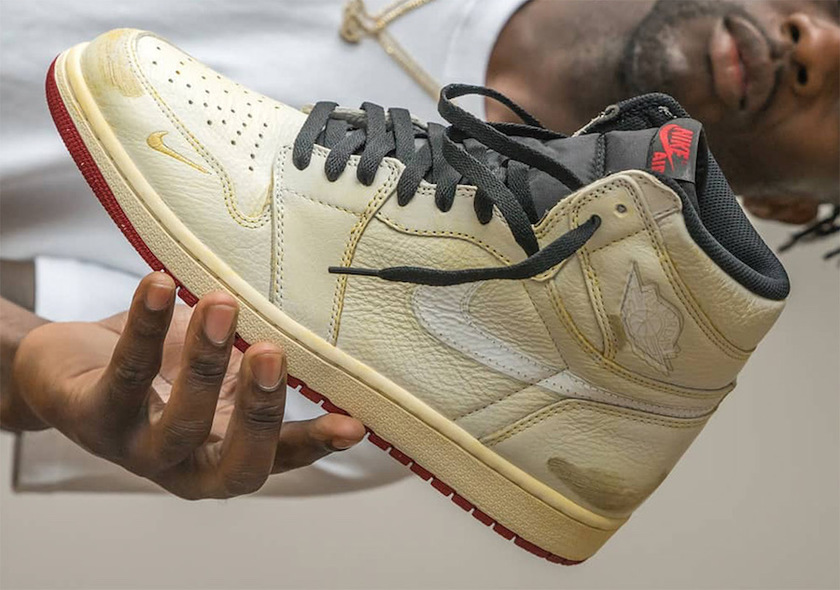 这款全新联名 AJ1 以奶油色的皮革覆盖整个鞋面,飞翼 Logo 以及 Nike Swoosh 采用纯白装点。鞋舌以及内衬辅以纯黑色调搭配,鲜红的 Nike Air 细节点缀于鞋舌之上,最后辅以红色大底收尾,与早先释出的假想图相差巨大。