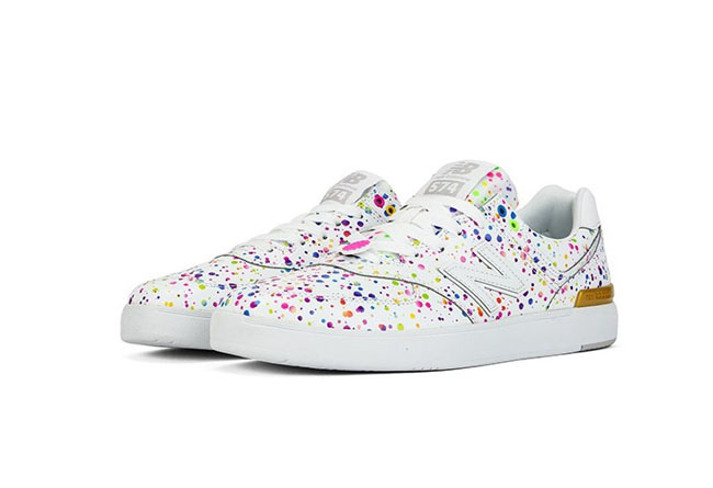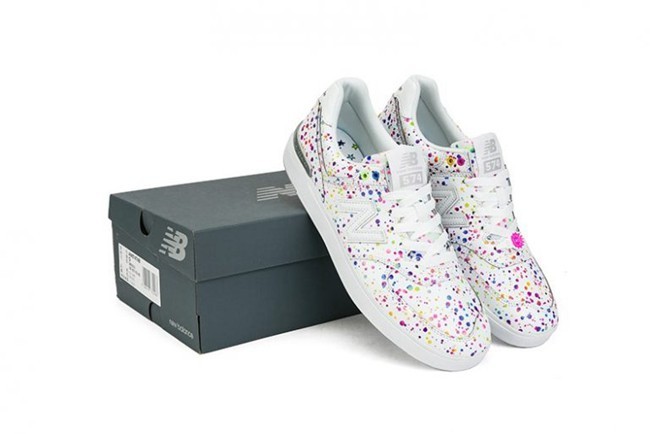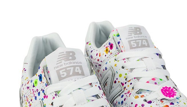 应景七夕, New Balance 推出了七夕烟火主题套装系列鞋款,为情侣们提供了更多选择,而其中此款 574 平底款式颇为出彩。鞋面以白色为基底,整体施以彩虹色泼墨,展现出七夕夜空绽放的烟火效果。同时鞋带扣上的粉色烟花同样表明了鞋款主题,左右脚后跟稳定块分别以金银呈现。