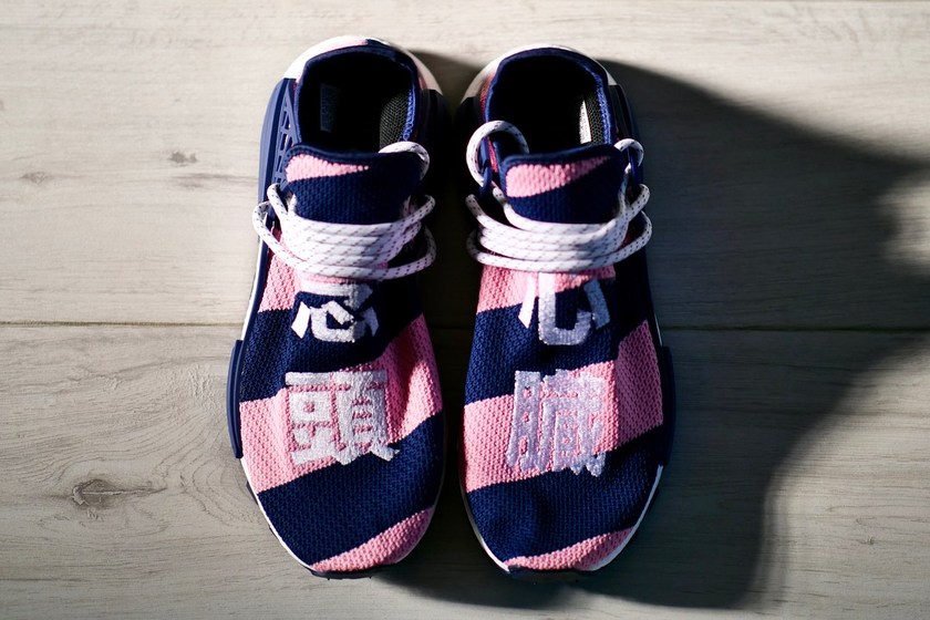 这双 Hu NMD 的 Primeknit 鞋身采用深蓝与粉红撞色的横纹风格,搭配相呼应的深蓝色支架和稳定块,而分别呈现在左右脚上的“心臟”和“念頭”字样,不知道是想表达什么特殊的理念。此外在后跟还可看到金色的 BBC Logo 点缀。据悉,该配色或将在 10 月份正式推出。