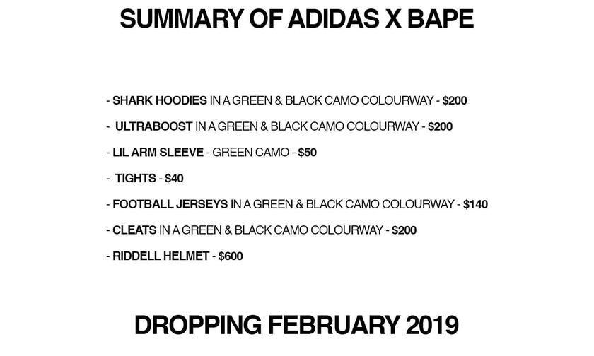 近日,情报账号 @py_rates 又曝光了 A BATHING APE x adidas 2019 年联名的其他单品。除了adidas Ultra Boost 鞋款外,此次联名系列中还将包括 SHARK HOODIE 鲨鱼卫衣、橄榄球衣、橄榄球鞋等等都会以一贯的迷彩元素呈现。至于具体的发售日期,预计会在 2019 年的 2 月份与大家见面,各位资深猿迷现在可以提前存钱了,因为头盔这样的激罕单品价格一定不菲。