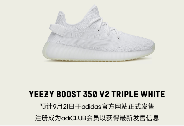 YEEZY BOOST 350 V2 “TRIPLE WHITE”终于确定将于本月迎来补货了!目前adidas官方商城已经出了预告,这双纯白Yeezy 将于9月21日登陆adidas官方商城发售,网络上传闻这次补货的货量还是非常大的,大家不妨提前做好准备,抓住原价入手的机会!