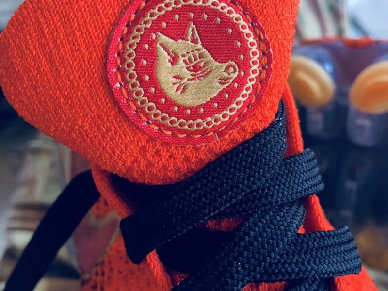 鞋款整体以橙红色混黑色的 Flyknit 编织面料呈现,搭配 Swoosh 边缘与后跟的金色花纹,同时鞋舌上搭载了比较Q萌的金猪图案,后跟鞋提上还有金色的 “己亥”刺绣,可以说是非常有新年的味道和感觉了。