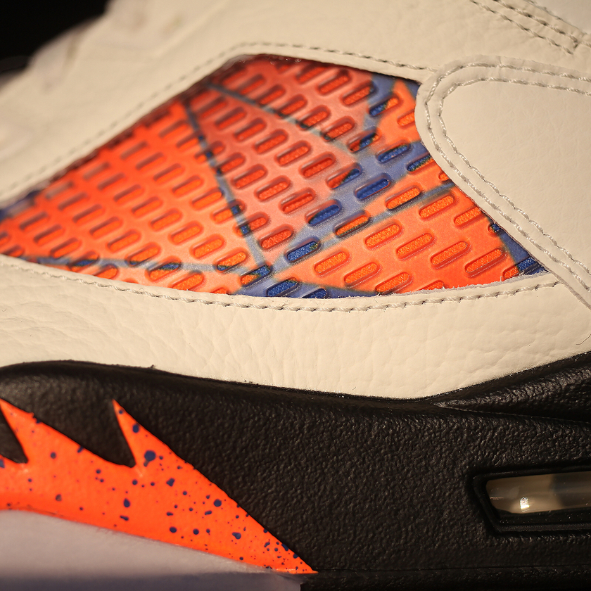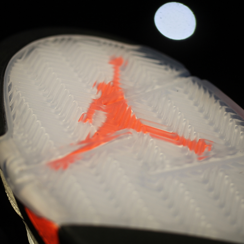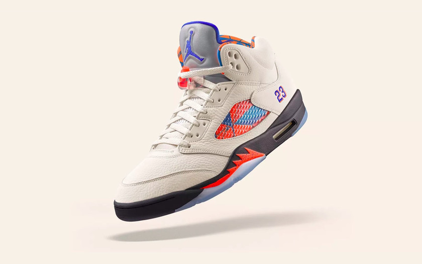 这款 Air Jordan 5 “International Flight” 的设计灵感来自于 1990 年的乔丹西班牙行。暖色系的帆白皮革象征着西班牙明媚的阳光,而内衬以及透气网上的几何设计则象征着巴塞罗那浓郁的艺术氛围。加上 5 代经典的 3M 反光鞋身、中底鲨鱼牙细节、以及 “23”
