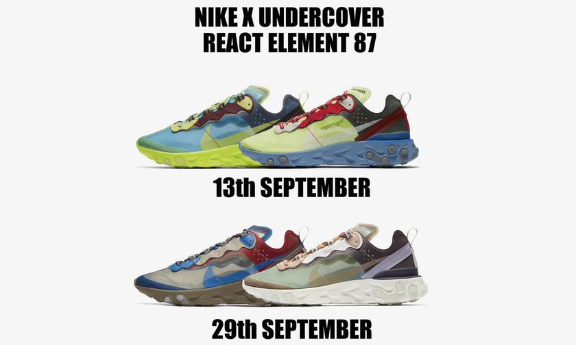 UNDERCOVER x Nike React Element 87 联名系列即将发售,不过今天情报账号 @py_rates 透露这 4 款配色并不会在同一天登场,而是两两分开于月中和月末分开发售。9 月 13 日发售的两款为带有荧光黄的配色,9 月 29 日则会上架深色与乳白色中底的两款。这样的设定其实是好事情,因为如果 4 色齐发的话,很可能你只可以着重一个选择;如今分开两次发售,手气好的没准能买到 2 双也说不定。眼看发售日在即,好好攒人品吧!
