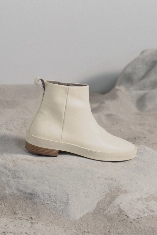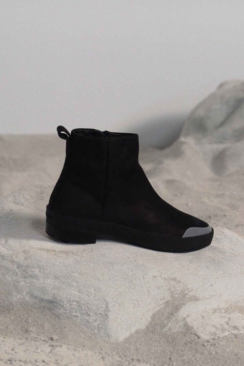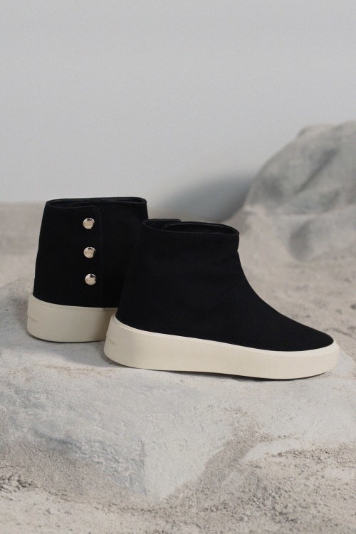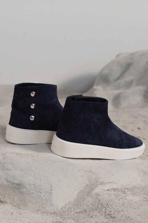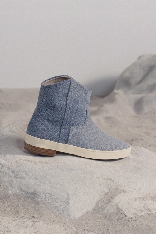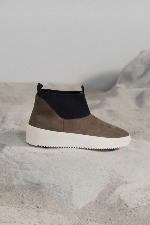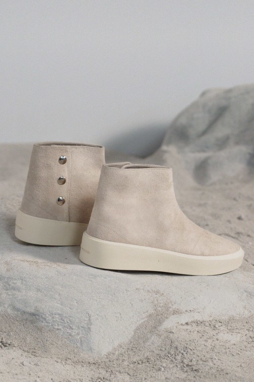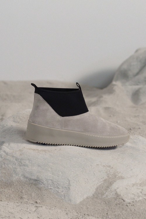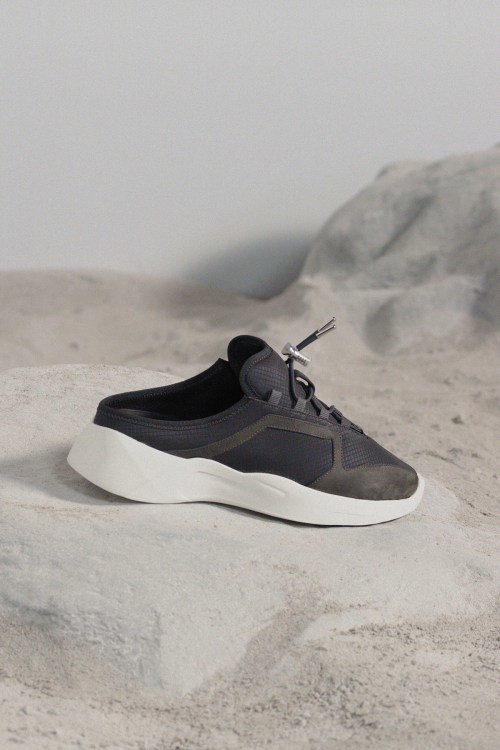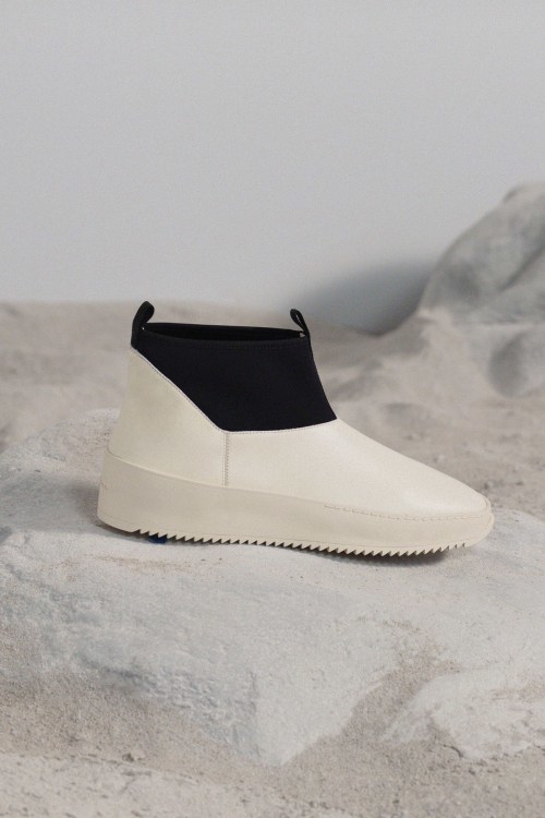 其中 Ski Lounge 可说是签名式 Basketball Sneaker 的又一次变奏,超高筒的鞋身由异材质拼接而成,并以魔术贴搭带和松紧束扣取代传统鞋带系统;