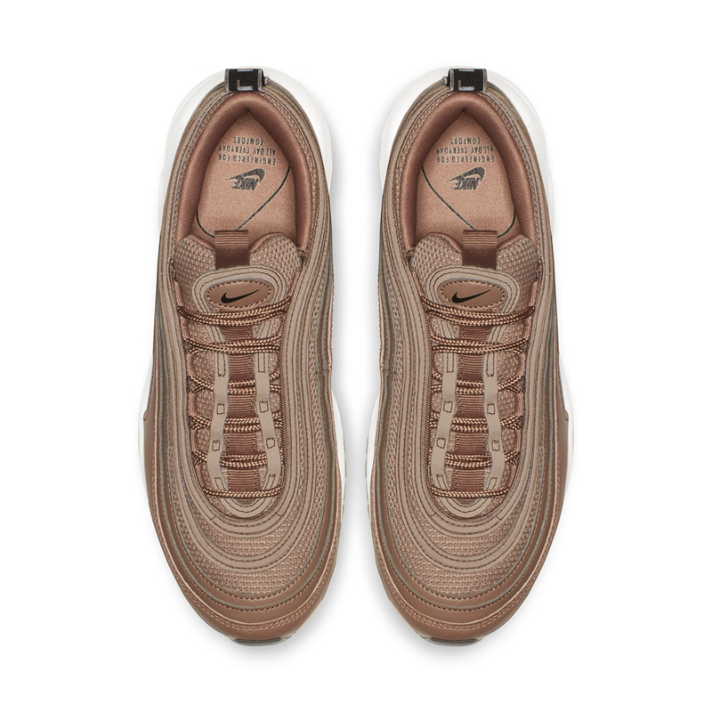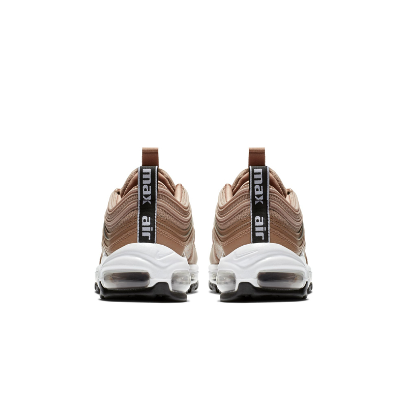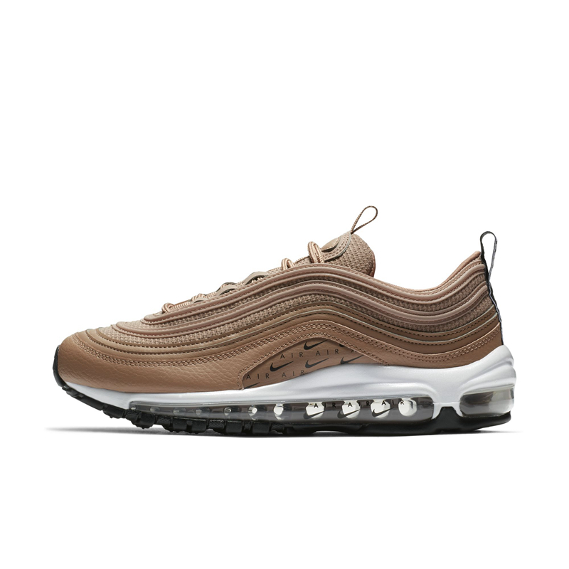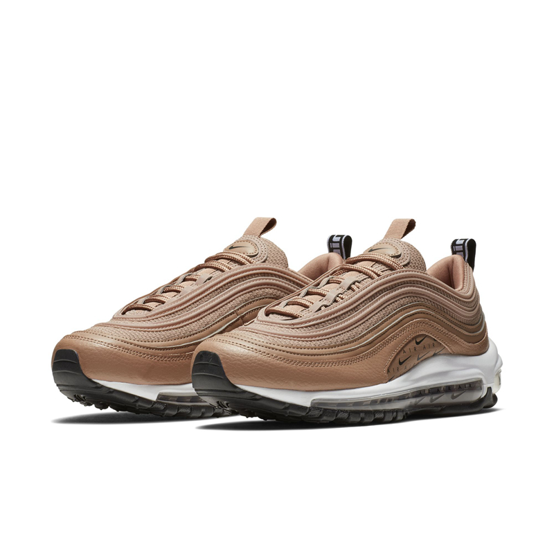 Nike Air Max 97 此番又有两款全新配色曝光,其中一款酷似金子弹配色,采用玫瑰金色调呈现。特别之处在于平时绣有 Swoosh Logo 的窗口和气垫侧面都布满了 Swoosh Logo 和 “AIR” 字体。