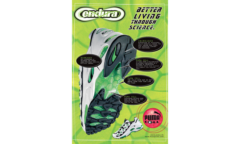 1998 年 PUMA 发布了品牌极受欢迎的鞋款 Cell Endura ,同时近日,PUMA 为庆祝 Cell 科技 20 周年,将这曾风靡一时的鞋款复刻重塑,并在生产过程中注入现代技术与先进 TPU 材质打造,例如橡胶鞋头、透气网眼鞋面、绒面革覆层、PU 涂层皮革覆盖层以及 EVA 中底等,以升级穿着脚感。