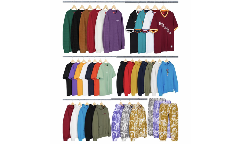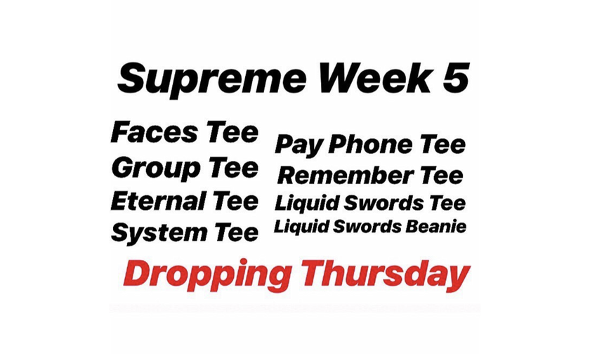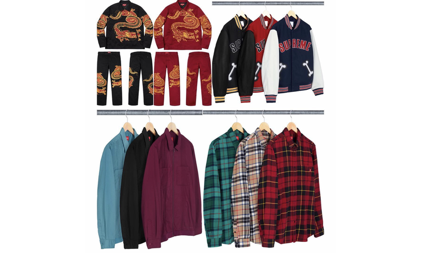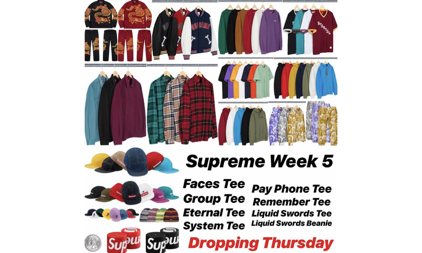 情报账号 @dropsbyjay 带来了Supreme 18 秋冬第 5 周发售单品一览,除了总共 8 款并未正式登场的印花 Tee(其中 4 款来自于 GZA 的合作系列) 之外,处于开季 “C 位” 亮相的 “中国龙” 夹克也将在本周迎来发售,其他款式还包括了骨头棒球夹克、耶稣圣母玛利亚套装、纯色拉链外套、格纹衬衣、花瓶帽衫、采用了不同 Logo 样式的长短袖 T-Shirt,以及帽款和自行车磁铁灯。