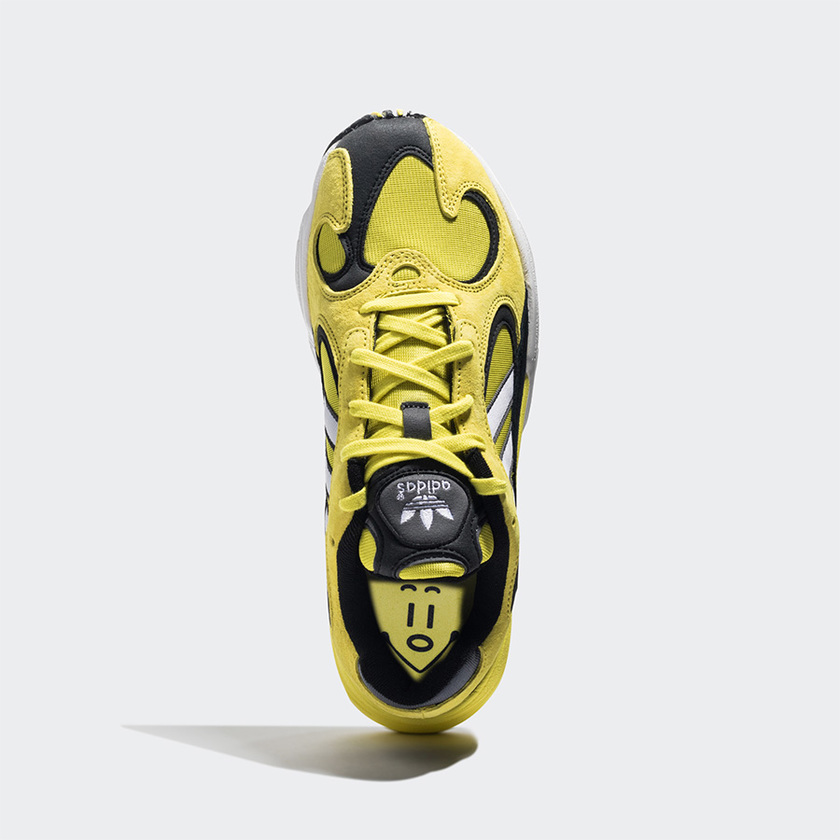 鞋身以黄色作为主色调,亮点在于鞋垫上有一个独特的笑脸 LOGO,跟其他的 Yung-1 都不同。这个元素来源于 Acid House 文化主题,这是德国在 70 年代发起的全民健身计划,与鞋款的复古运动基因相符。
