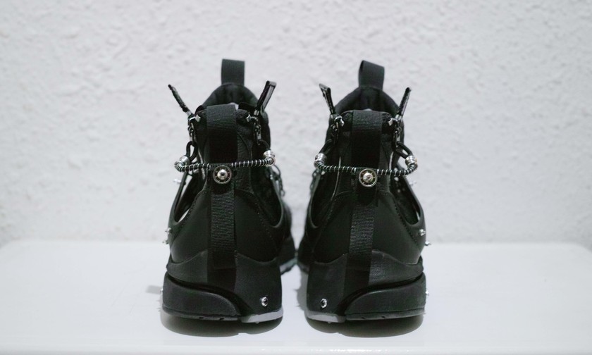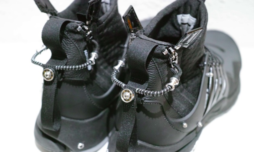 选用灰黑配色作为蓝本,将鞋面上的 “斑纹” 去除,提升黑色块的占比,为了使整体不显普通,Ziv 也在各处细节用上了铝合金材料点缀,轻且不生锈。鞋头烫胶加入暗线条,另鞋子更有层次;后跟处添加的弹簧则使得绳子更加立体。