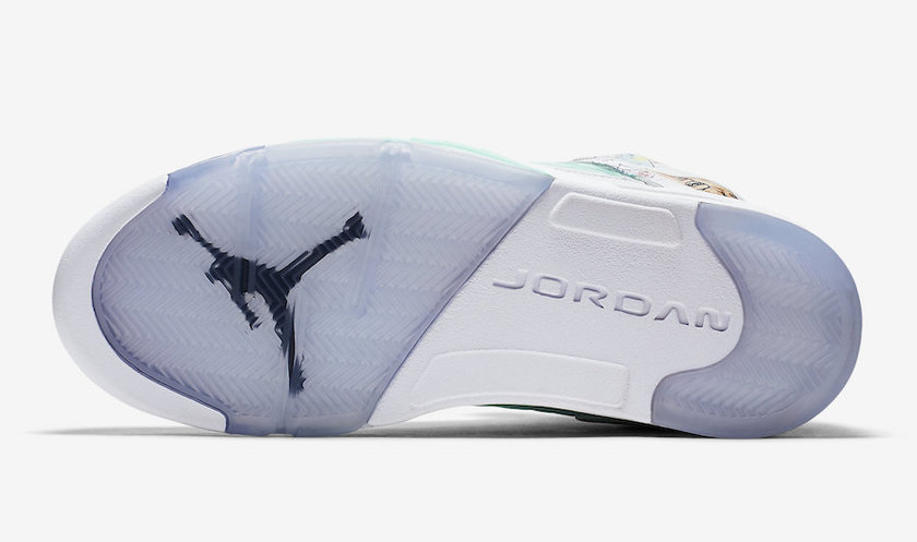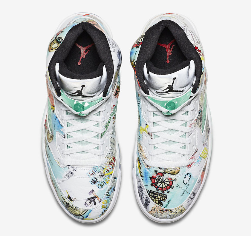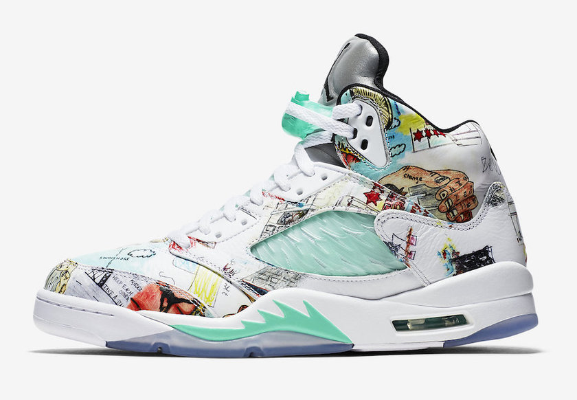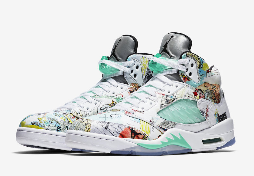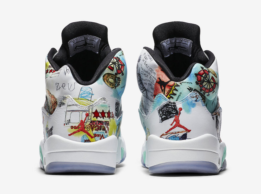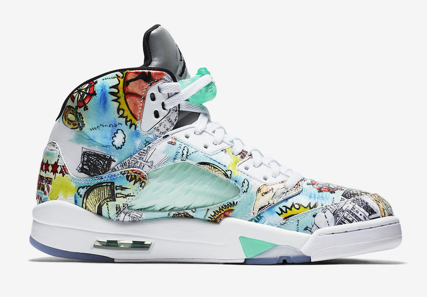 这款全新的 Air Jordan 5 “Wings” 以全新设计元素将 Wings 主题呈现。其纯白鞋面上布满涂鸦元素,街头风十足。而带有夜光效果的细节 —— 翅膀状鞋带扣以及羽毛状透气网,则彻底替代了原有的黑金羽翼元素。风格转变之大,甚至给人这是全新系列的错觉。