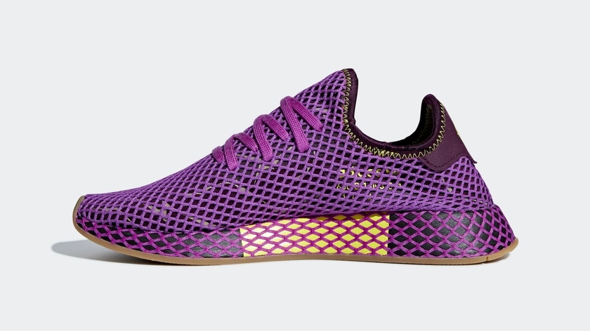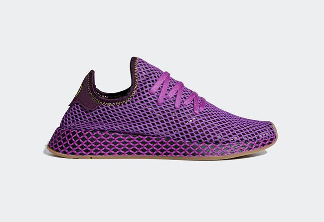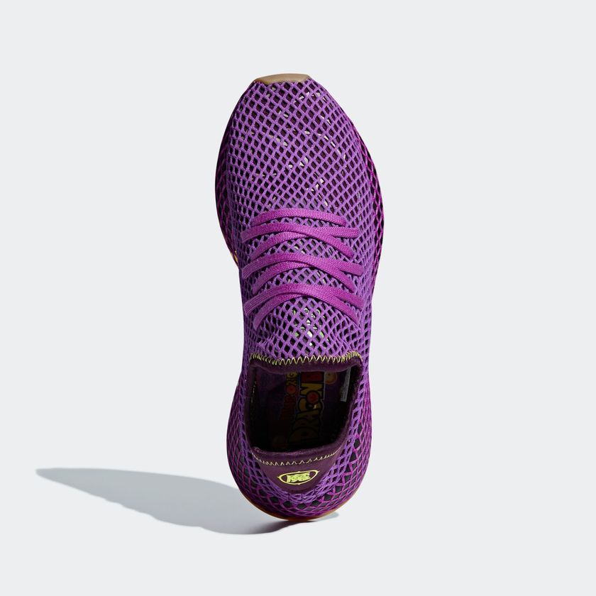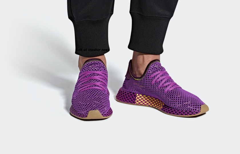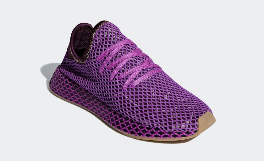 “悟饭”主题的adidas Deerupt 鞋款整体以黑、紫两色为主调,大面积的紫色以网格的形式勾勒而出,与悟饭在动画中紫色的服装相呼应。