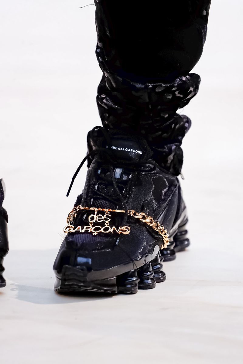在早前于巴黎时装周举办的 2019 春夏女装系列发布会上,COMME des GARÇONS也同步曝光了与 Nike 的全新联名企划。从模特们脚上可看到,川久保玲这次选择 Nike 经典的 Shox 作为原型,一改原本鞋面结构,甚至加入了时装化的毛边细节,而除了 Shox 招牌的大底外,中足处带有品牌标志的金属装饰链也十分引人注目。此外,在鞋舌上还分别以「COMME des GARÇONS」和「Nike Shox」字样点缀。目前,COMME des GARÇONS 与 Nike 均尚未透露该鞋款的确切发布时间。