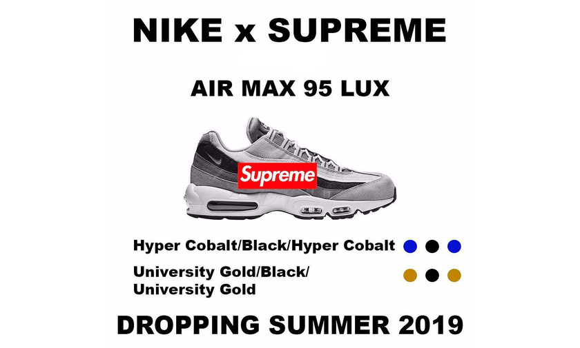 情报账号 @py_rates 带来最新消息,明年的 Supreme x Nike 终于回归 “主流” 了。据悉在 2019 春夏季中我们就能见到 Supreme x Nike 联名 Air Max 95 Lux,Lux 的主要体现当然是在材质的选择上更为高级;从现有的配色信息来看会有黑/金以及黑/深蓝 2 款。虽然时间还早,但绝对值得期待。