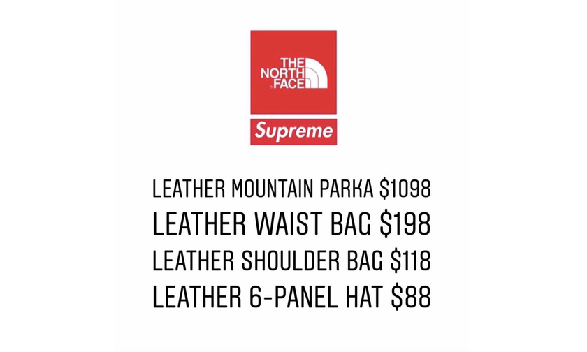 Supreme x THE NORTH FACE 联名终于带来了最新一季的合作,相比于前几季的设计,这次的皮革材质在质感和搭配上无疑会更加受到青睐,不过在你摩拳擦掌准备抢购之前,情报账号 @dropsbyjay 为我们曝光出了这一系列的发售价格。