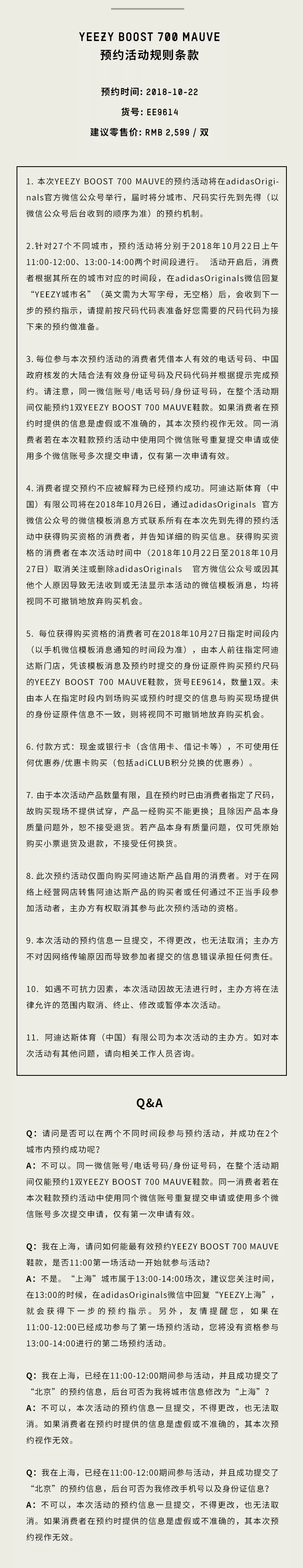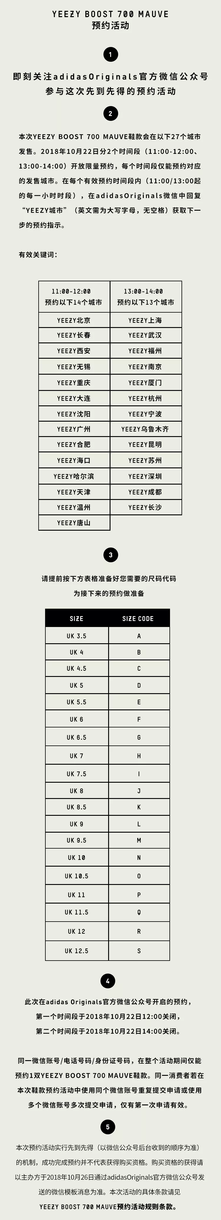 此次发售与 Yeezy 700 的首发配色相同,分两个时间段开放限量预约,每个时间段仅能预约对应的发售城市,其中第一时间段为 10 月 22 日今天的 11 点到 12 点,第二时间段为今天下午的 1 点到 2 点。感兴趣的朋友可以往下了解详情!