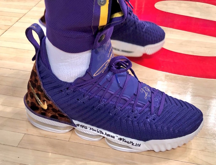 此番释出的全新配色与前段时间发售的 Nike LeBron 16 “King” 设计风格基本一致,仅仅将酒红的鞋面颜色转换为湖人标志性的紫色。加上鞋舌上黄色签名细节以及豹纹后跟中包含的金色 Nike Swoosh,直击湖人主题。