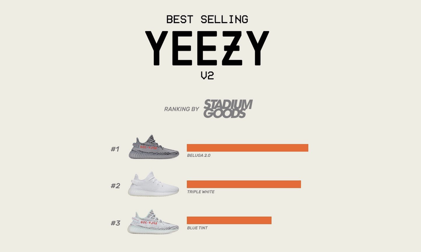到目前为止,Yeezy Boost 350 V2 已经推出了不下十余款配色,相信一定有人在好奇,它们中销量最高的到底是哪一双?近日知名球鞋店铺 Stadium Goods 便给出了一个可以供我们参考的答案,在 3 周年之际,他们统计了以往所有 350 V2 配色的销量,最后得出了一份前三名的榜单,第三名为 Blue Tint,第二名为 Triple White,而第一名便是 Beluga 2.0。当然了,这与这三款配色相对更大的发售货量以及价格都有着很大的关系,所以最终的结果和你预想的相符吗?