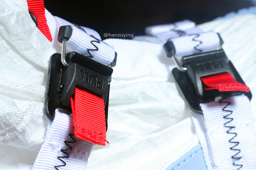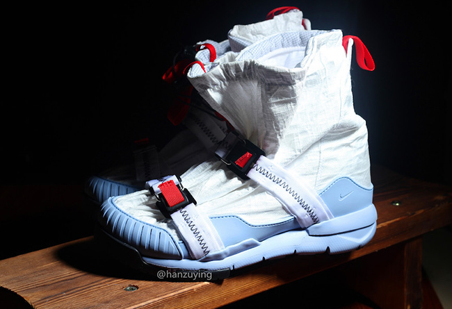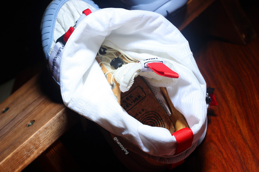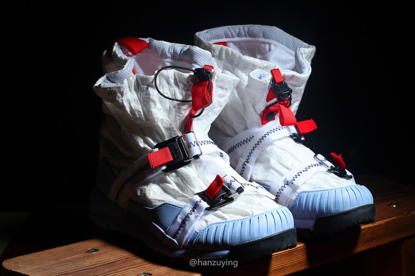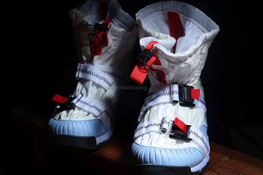 其设计灵感依旧源自于火星登陆,并采用了“鞋中鞋”的双层设计,其中内侧延续了初代 Mars Yard 设计,不过将鞋舌部分加长并以松紧绑带替换鞋带方便用户穿脱,而外侧则由柔韧且耐用的白色 Dyneema 材质包裹,更以尼龙绑带和搭扣进行固定,增强了鞋款的防水和保暖性能,最后搭载浅蓝色 TPU 中底和耐磨 SFB 外底而成。