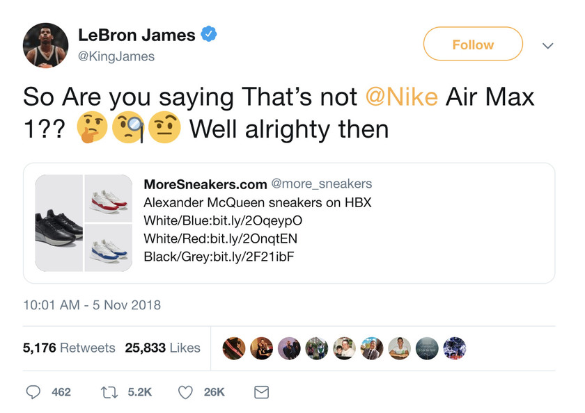 因为詹姆斯看到这双鞋后,就在 Twitter 上转发并表示 “这不就是 Nike Air Max 1?”的确从配色到鞋型,看到第一眼很难不把它和 Air Max 1 联系在一起。借鉴还是抄袭,你怎么看?
