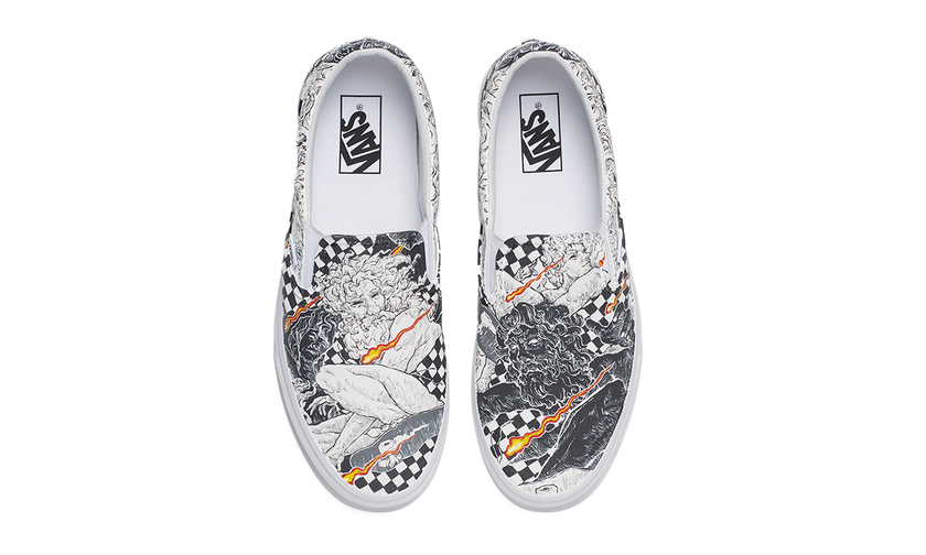 最终由菲律宾艺术家 John Nikko S. Pelaez,凭借在 Vans Slip-On 上的“滑板之神”设计成功摘冠。Pelaez 的设计图案传递的是:我们每个人都是自己的神,是自我命运的主宰者,是人生道路的选择者。熊熊烈火代表生命中所有需要克服的障碍,黑白主题则象征中国的阴阳哲学,即人生将趋于平衡与和谐的必然性。