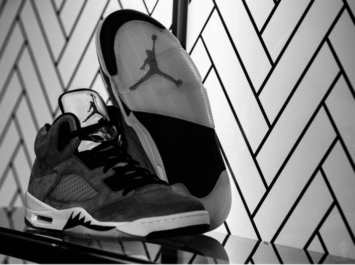 2016 年,乔丹之子马库斯·乔丹在美国芝加哥开设的球鞋店铺 Trophy Room 与 Jordan Brand 合作推出了多款正代联名,其中有一款便是 Air Jordan 5 联名。