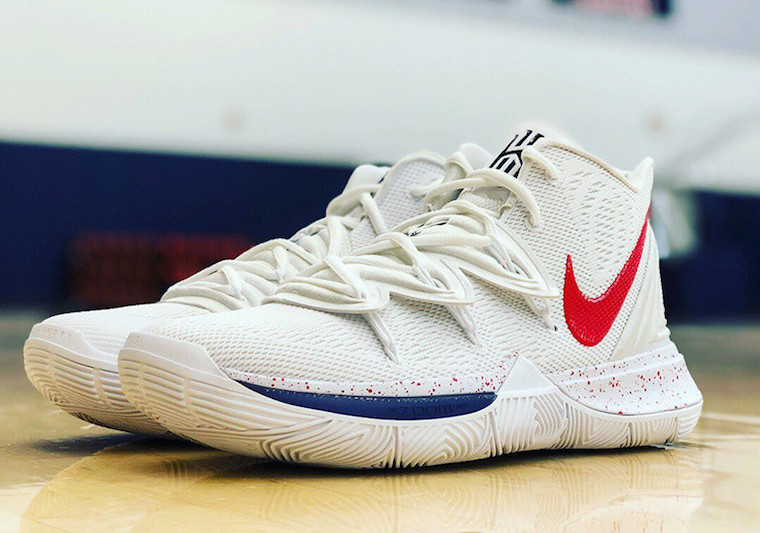 此番 Kyrie 5 UConn PE 以白色为主,辅以红色和蓝色细节点缀,营造出了强烈的视觉效果。而带有斑点的中底和后跟处哈士奇队标志,则完善了设计,直击主题。
