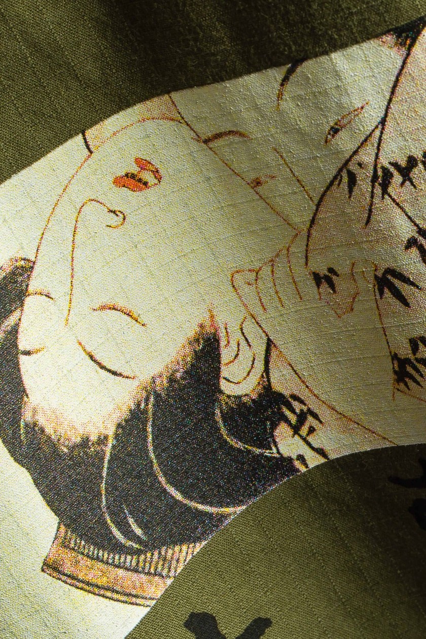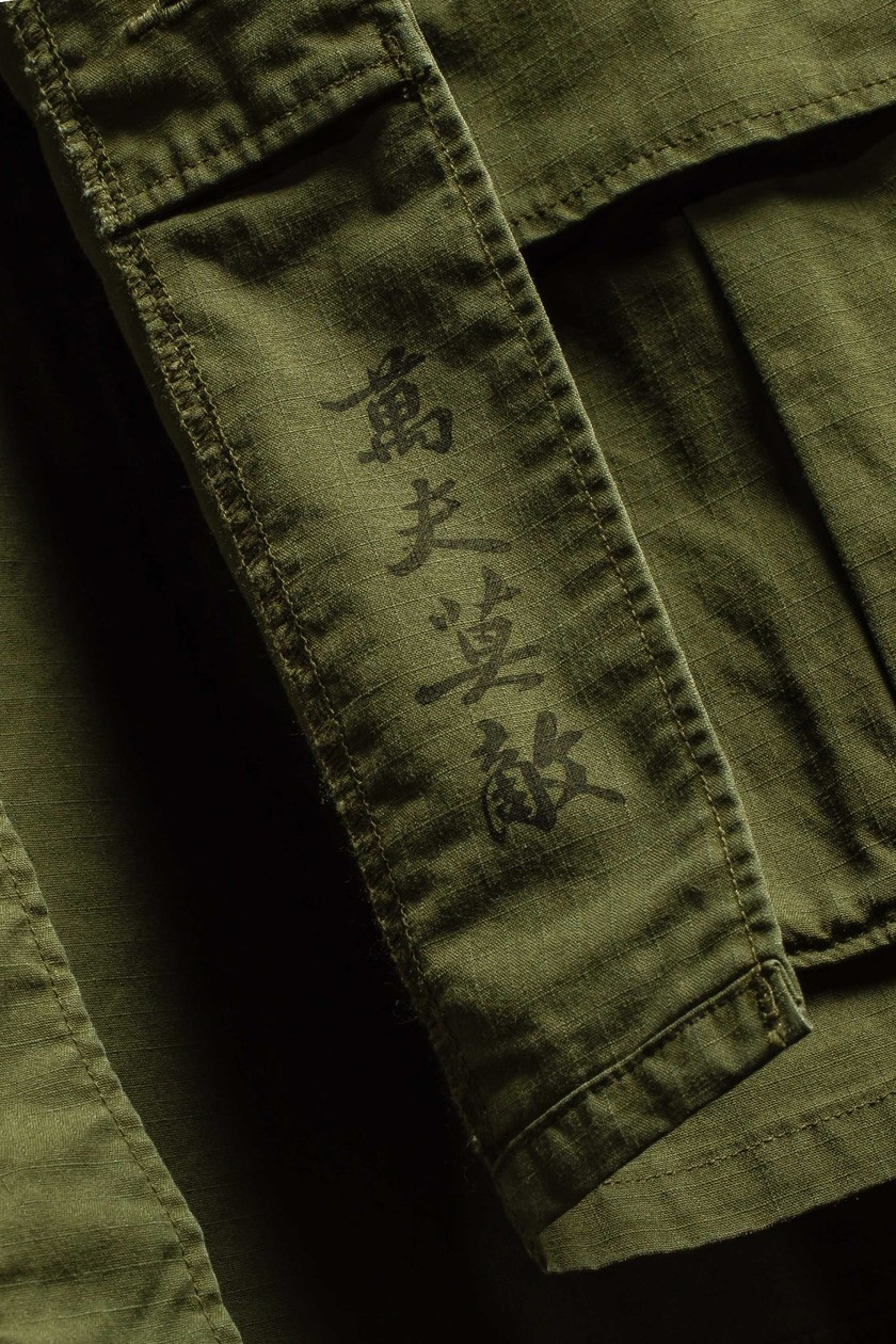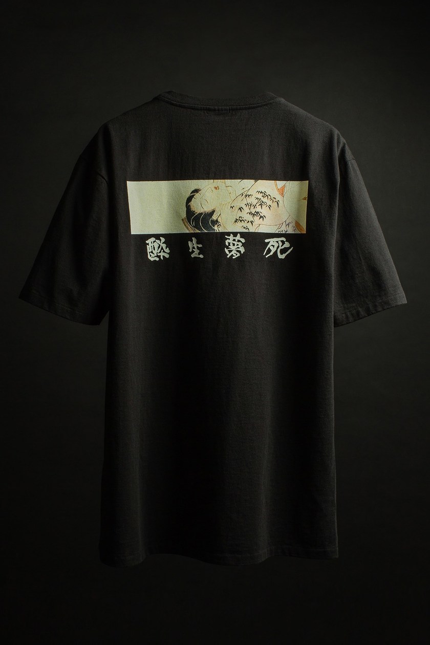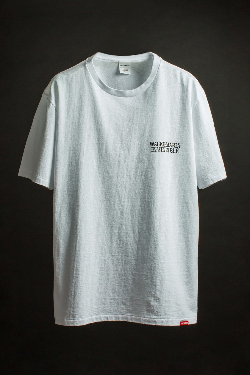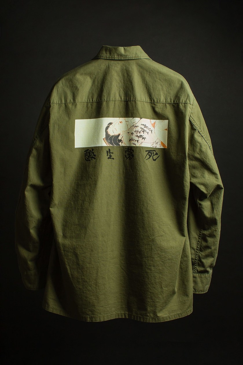整个系列包括冬季帽款、T-Shirt、军装恤衫以及外套等,设计均用上 WACKO MARIA 标志的“醉生梦死”标语,配搭品牌的日本艺妓情色图像;同时 INVINCIBLE 更在其四袋军装恤衫内侧加绣“万夫莫敌”字样,去代表着双方结合并走到上海的象征。