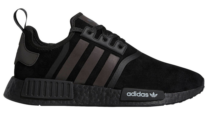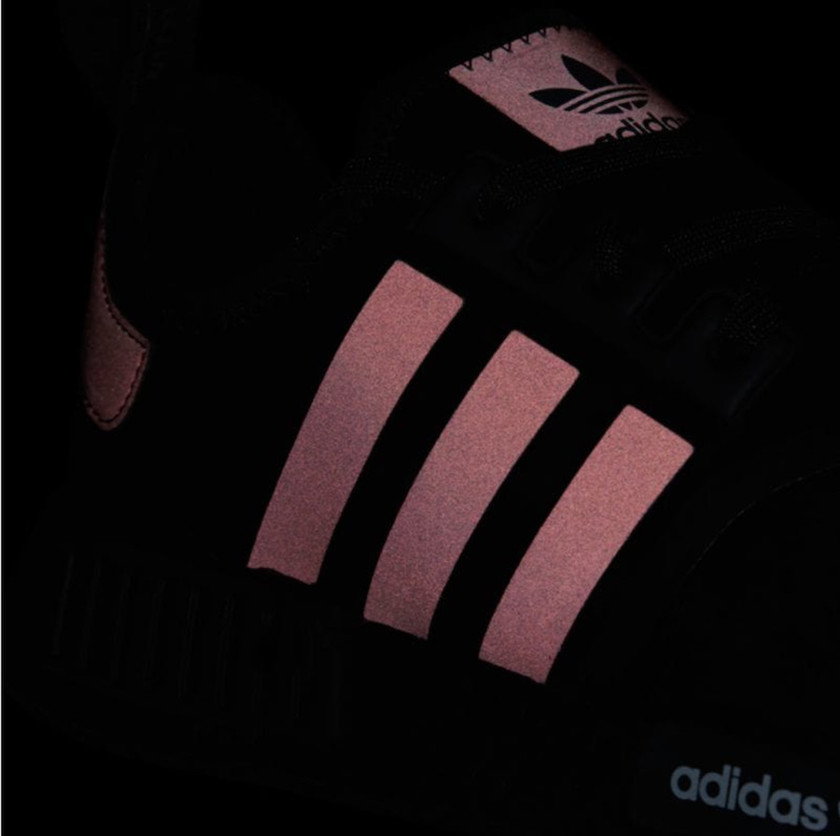 全新系列包含黑、白两款配色,其中黑色版本整双鞋都以黑色覆盖,鞋舌、三条杠标志与后跟加入 3M 反光材质,在黑暗中散发出神秘的粉红色光芒。