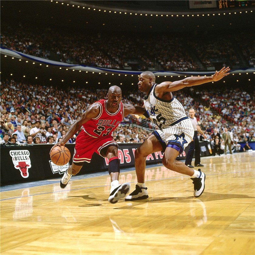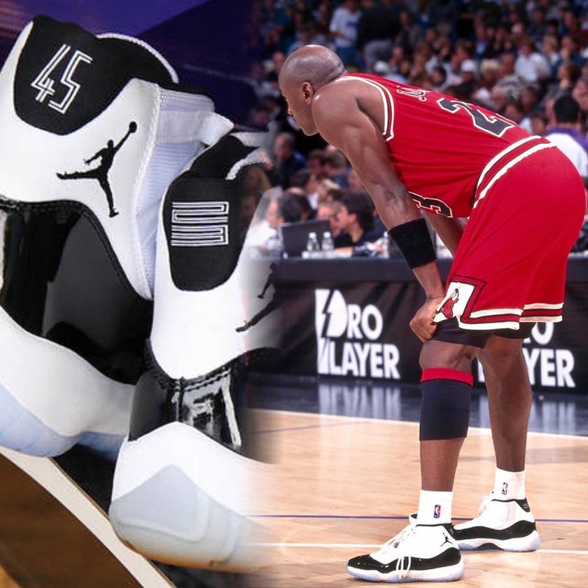 但是相信很多人都知道Concord的故事,并且见过以下这张图片,乔丹95-96赛季通过一句简单的“I'm back.”复出,当赛季身披45号战袍并上脚AJ10,到了东部决赛对阵奥兰多魔术时,他终于仍不住提前上脚了AJ11 Concord,当时Air Jordan还没对这双鞋做任何宣传。
