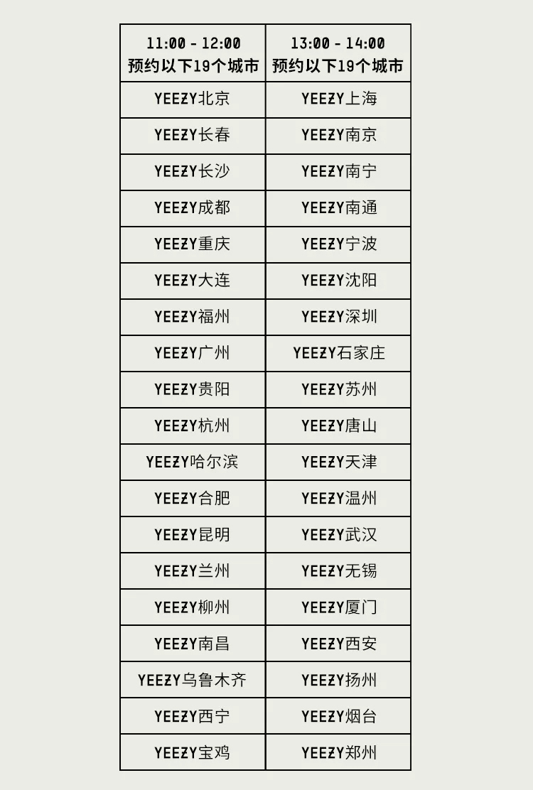 此次发售城市数量为 38 个,将针对不同地区分成 2 个时间段 (11:00-12:00/13:00-14:00) 开放排队码预约。大家只需根据下表,按照自己城市的对应时段,在 adidasOriginals 微信中回复 “YEEZY城市”(英文一定要全大写,中间无空格),即可获取下一步预约提示。
