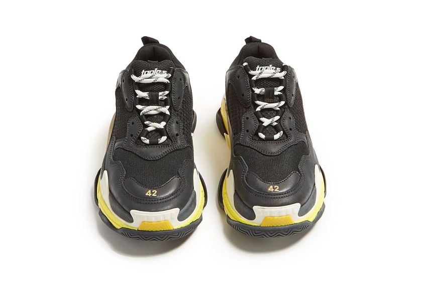 除了透明气垫版本外,Balenciaga 也继续为初代的 Triple S 带来全新配色。这双在早前上架的鞋款采用了黑黄的配色组合,由皮革与网眼结合构成的「Dad Shoe」鞋身选择黑色作为主调,鞋头与后侧分别融入金色刺绣鞋码和 Balenciaga Logo 点缀,而取自跑步鞋、田径鞋和篮球鞋的三层复合大底则以黑、白、黄叠合呈现。目前,该鞋款已可于 MATCHESFASHION 等指定店铺购得,定价为 $930 美元。