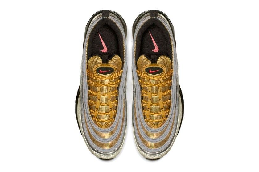 Nike 再度为 Air Max 97 带来全新配色「Metallic Gold/Metallic Silver」,从配色名称便能得知此鞋款采用带有金属质感的金、银两色打造而成,可以说是“金银子弹合体配色”了!