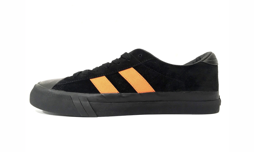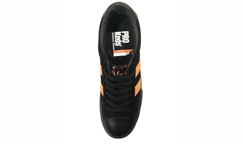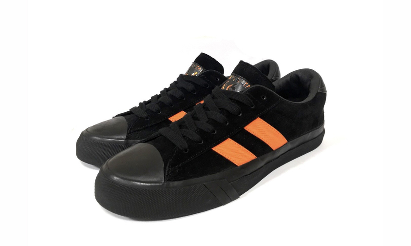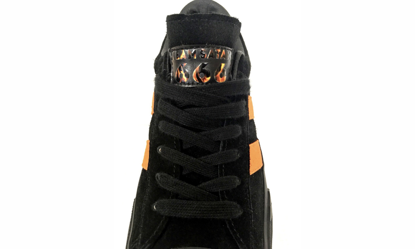该鞋款以 PRO-Keds 的 “Royal Plus” 为蓝本打造,黑色的鞋面两侧设置了两条鲜艳的橙色线条,代表魔鬼意象的 “666” 标志在鞋舌处以火焰的图案呈现。该鞋款预计明年 1 月中登陆 R.inc 在线商店开售。