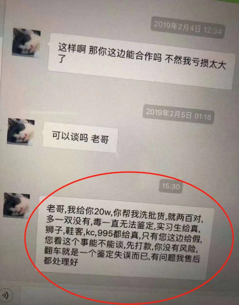 但是就在最近有假鞋贩子联系到get鉴定师,希望以20万的价格收买鉴定师,将其一批假鞋判断为真,我们的鉴定师严词拒绝。这早已不是第一次收到假鞋贩子的贿赂了,甚至以前还有假鞋贩子对鉴定师进行恐吓,声称已经搜集了鉴定师的个人信息,威胁将危及鉴定师的人身安全,态度行为及其恶劣。