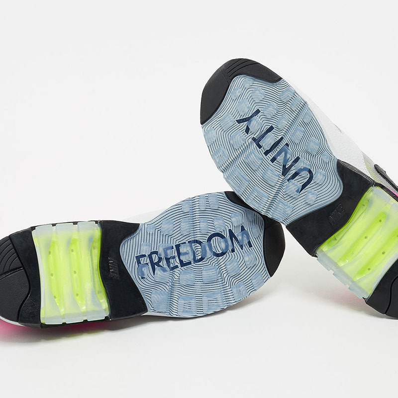 鞋面采用了透明网布拼接皮革材质,荧光黄的配色若隐若现十分养眼,另外后跟配合粉色点缀,潮流感满满。另外在鞋底我们还能看到“Unity” 与 “Freedom”的字样展现了德国柏林墙推倒后的社会新局面。这款配色将于3月26日于于柏林指定店铺出售,3月30日陆续在欧洲地区上架。国内的具体发售信息我们将持续关注。