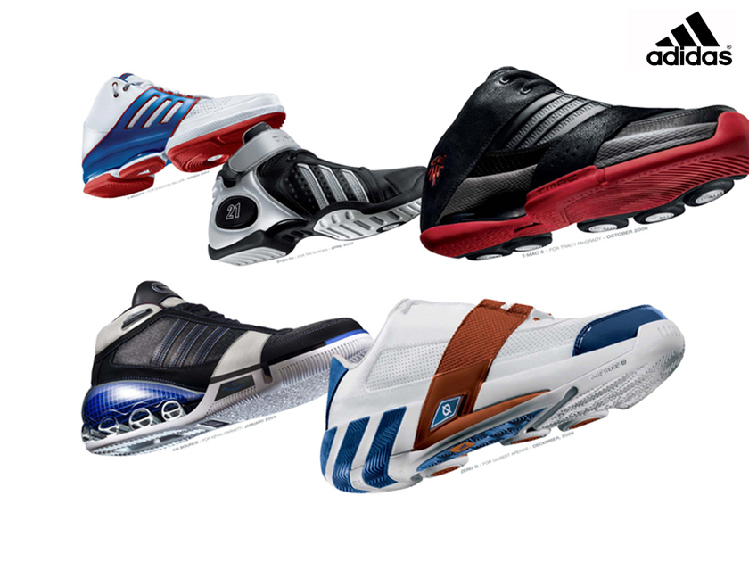 上期讲到阿迪达斯在2003-2004年集齐了麦迪、阿里纳斯、比卢普斯、邓肯、加内特,五虎上将,并且在随后几年风生水起,包揽了联盟众多个人奖项,五虎的鞋子也卖的相当火爆,至2006年,达到了阿迪篮球鞋的巅峰,其篮球鞋阵容已经可以正面和耐克刚一下了。