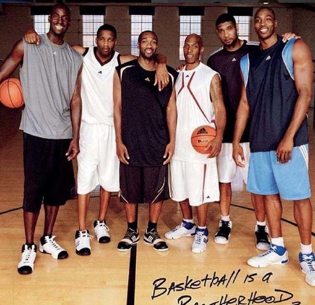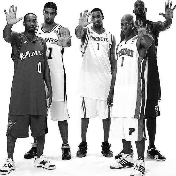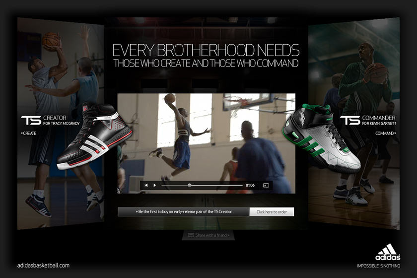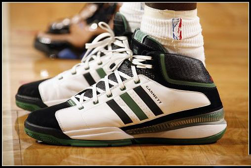 好在阿迪达斯并没有让五虎同穿一款鞋子,他们为麦迪、阿里纳斯、比卢普斯这些外线球员订制了Creator系列团队球鞋,为邓肯、加内特、等内线球员订制了Commander系列团队球鞋,虽然代言侧重不一样,但也出现过混穿的现象。