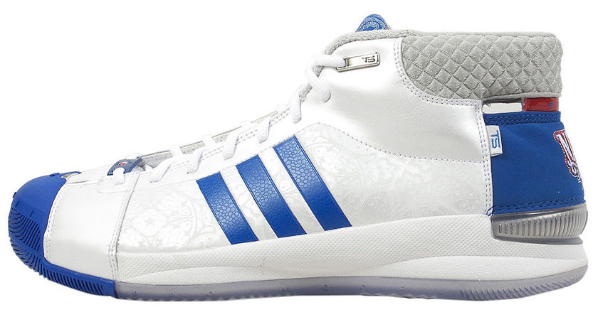 也许很多球迷会误以为这双鞋子是T-MAC7 ,因为麦迪的广告海报给我们留下了太深刻的印象。这是TS首发款,也是是做工用料最好的一款,皮质鞋面质感厚重,客场版本鞋身前处采用了woven材质,让人眼前一亮,尽管用料很足,但是其重量控制的相当好,并且有 Full Forefoot adiPrene+科技的加持,让这款TS球鞋出道既巅峰。