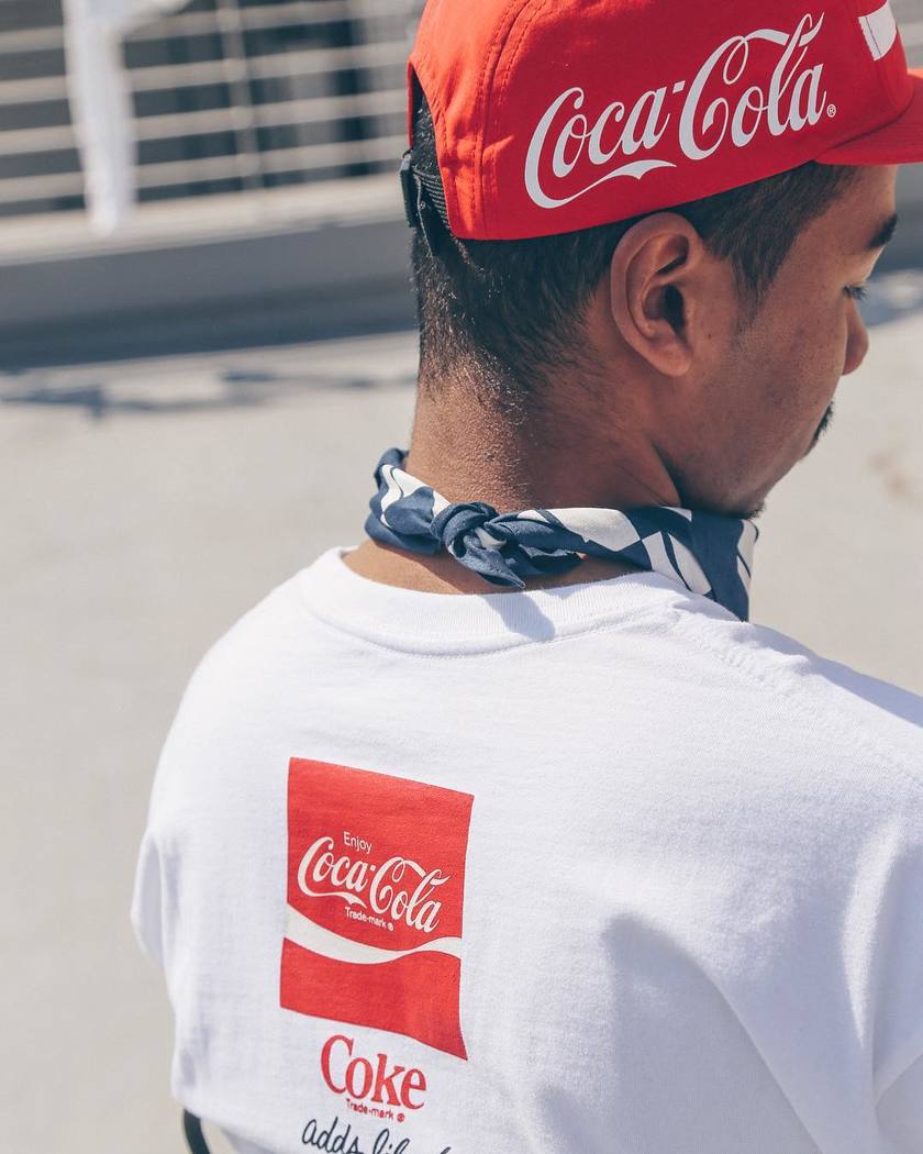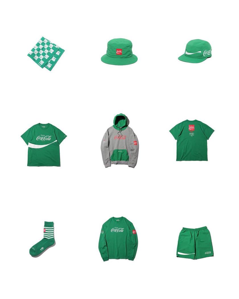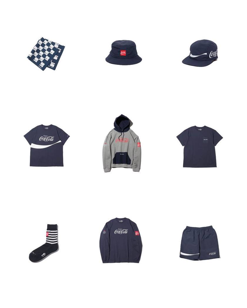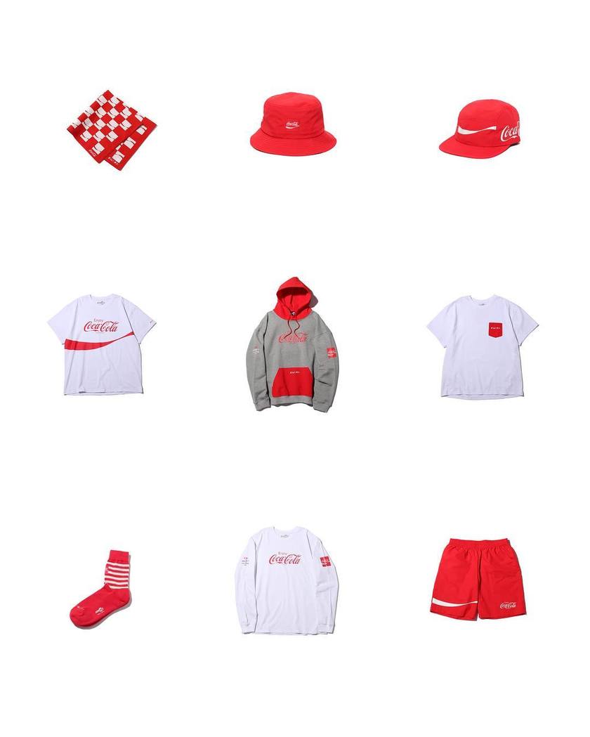 本次单品包括 T恤、卫衣、短裤、帽子、袜子以及方巾,三色混搭也能搭配出与众不同的休闲潮流感。而超级显眼的 Coca Cola 标志出现在服饰上还是很具趣味性的。